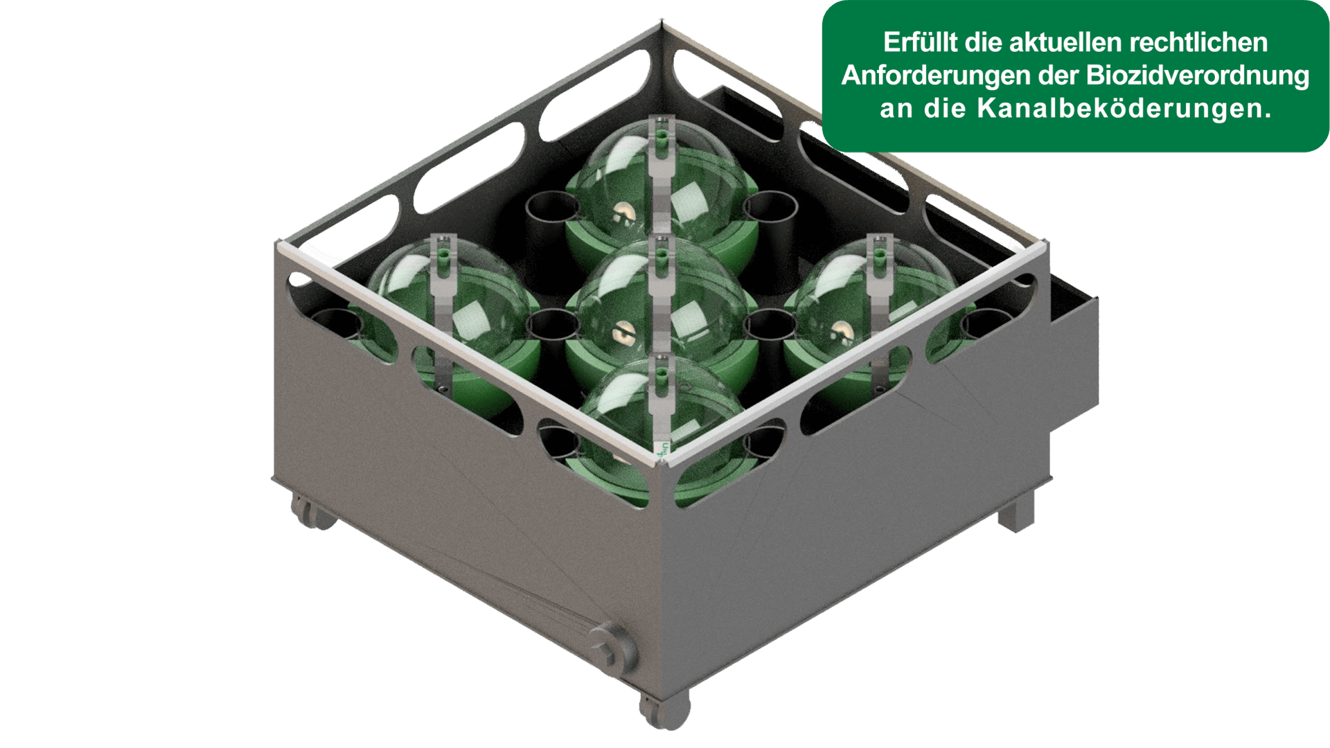 Die kleinen handlichen Kugeln sind etwa so groß wie ein Fußball. Sie schützen den Köder zuverlässig vor Wasser. Er kann schnell gewechselt, aber nicht von eindringendem Wasser weggespült werden. Für die Montage ist kein Einstieg in den Schacht notwendig. Ganz ohne Beschädigungen (kein Bohren erforderlich) wird eine Kugel mit einem Seil am Schmutzfänger befestigt.